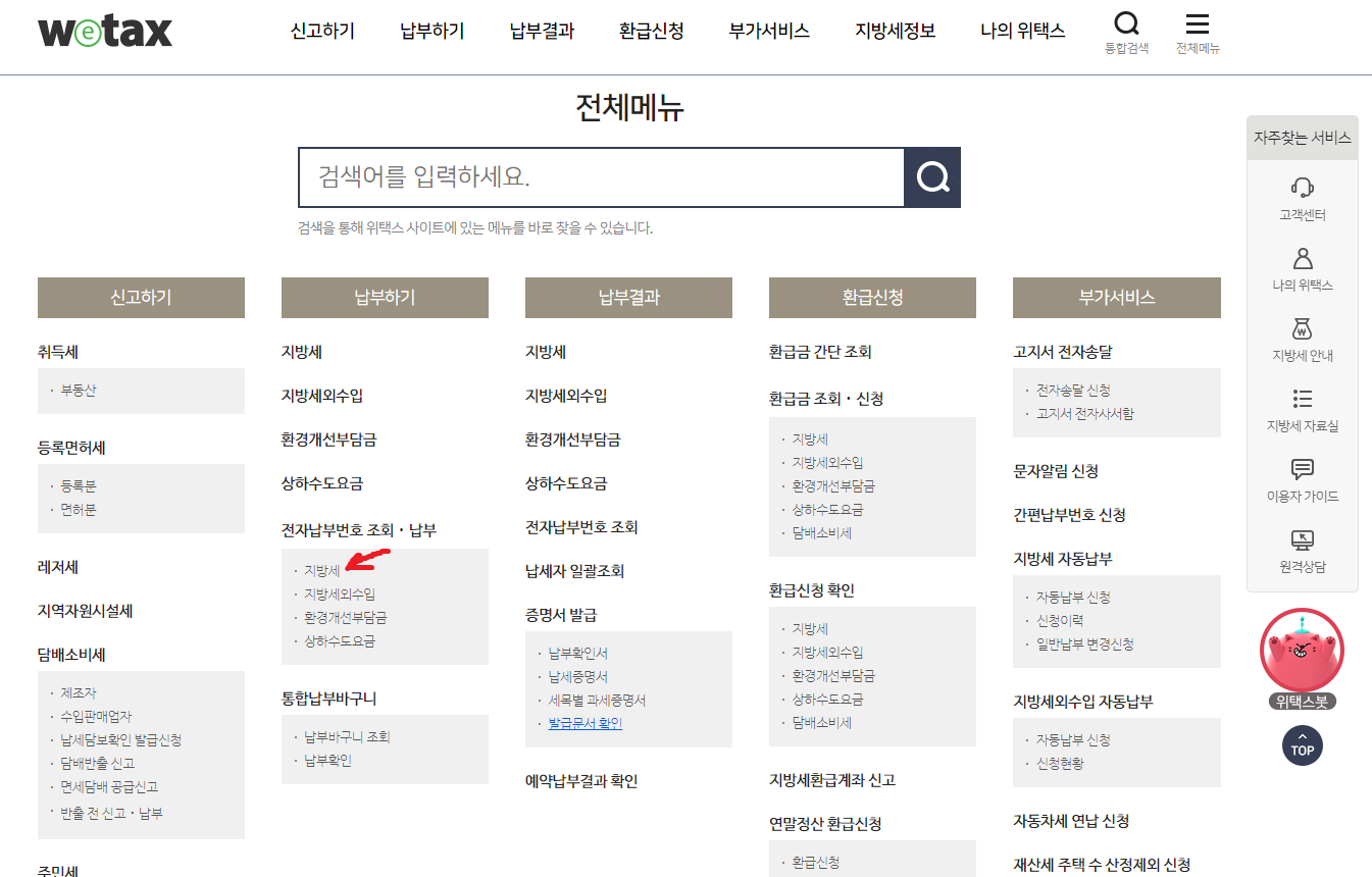 1. 우측상단의 전체 메뉴 클릭 - 납부하기 아래 전자납부전호 조회 아래 지방세 클릭