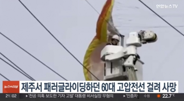제주도에서 동력 패러글라이딩을 즐기던 A씨(60대)가 고압송전선에 끼어 넘어져 숨지는 사고가 발생했습니다.