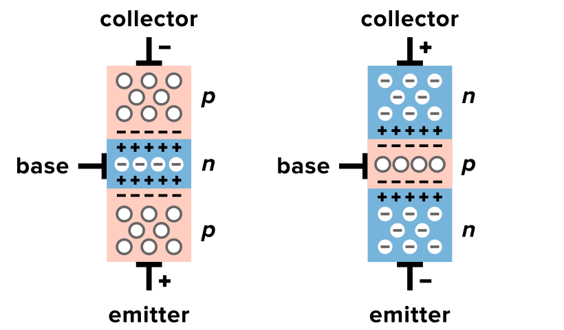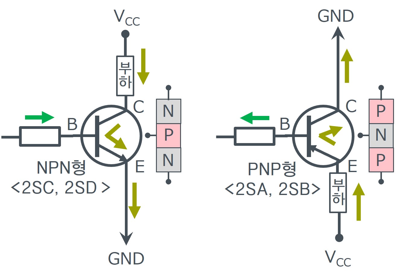 NPN형은 이미터와 컬렉터가 N형 반도체이고, 베이스가 P형 반도체인 트랜지스터입니다. PNP형은 그 반대입니다.