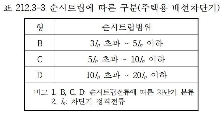 3. 과전류차단기로 저압전로에 사용하는 산업용 배선차단기(「전기용품 및 생활용품 안전 관리법」에서 규정하는 것을 제외한다)는 표 212.3-2에 주택용 배선차단기는 표 212.3-3 및 표 212.3-4에 적합한 것이어야 한다. 다만, 일반인이 접촉할 우려가 있는 장소(세대내 분전반 및 이와 유사한 장소)에는 주택용 배선차단기를 시설하여야 한다.