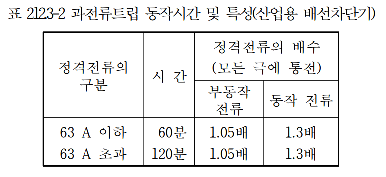 1. 과전류 보호장치는 KS C 또는 KS C IEC 관련 표준(배선차단기, 누전차단기, 퓨즈 등의 표준)의 동작특성에 적합하여야 한다.