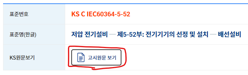 - 나라표준인증 홈페이지 가서 국가표준 탭에 표준번호 탭에서 'IEC60364-5-52' 를 검색하세요.