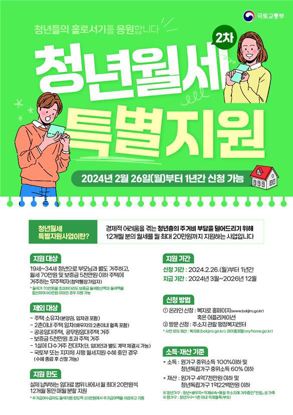 정부가 최대 월 20만 원의 월세를 지원받을 수 있는 '2차 청년월세 특별지원' 신청을 2024년 2월 26일 09시 ~ 2025년 2월 25일 24시 까지 받습니다.